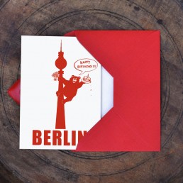 Der Fernsehturm ist der Lieblingsplatz unseres Bären, Berlins bekanntestes und Deutschlands höchstes Gebäude. Entsprechend gibt es eine Kollektion mit Motiven für verschiedene Anlässe. Erhältlich als Postkarten, Magneten, Shirt, Tasse …