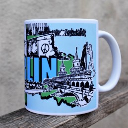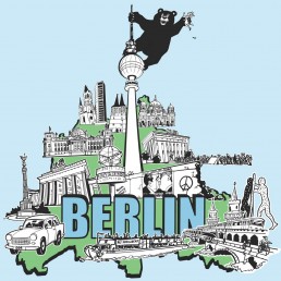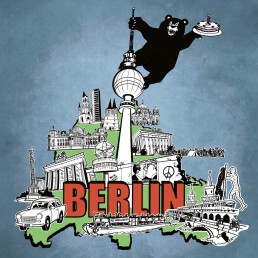 Das Wimmelbild vereint Berlins Top-Sehenswürdigkeiten in einem Panorama-Motiv. Zusätzlich lassen sich viele für Berlin typische Details wie U-Bahn oder Türsteher entdecken.